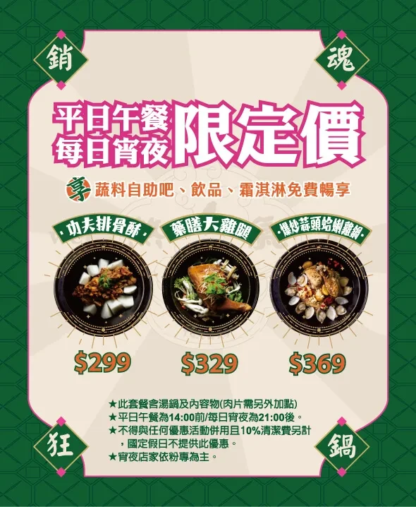 - 每人低消為一份套餐,共鍋費$199可享自助吧