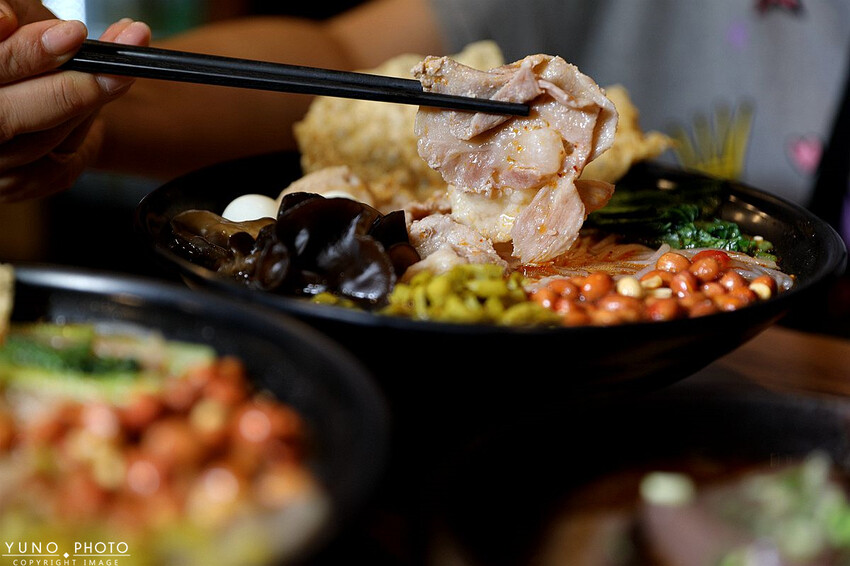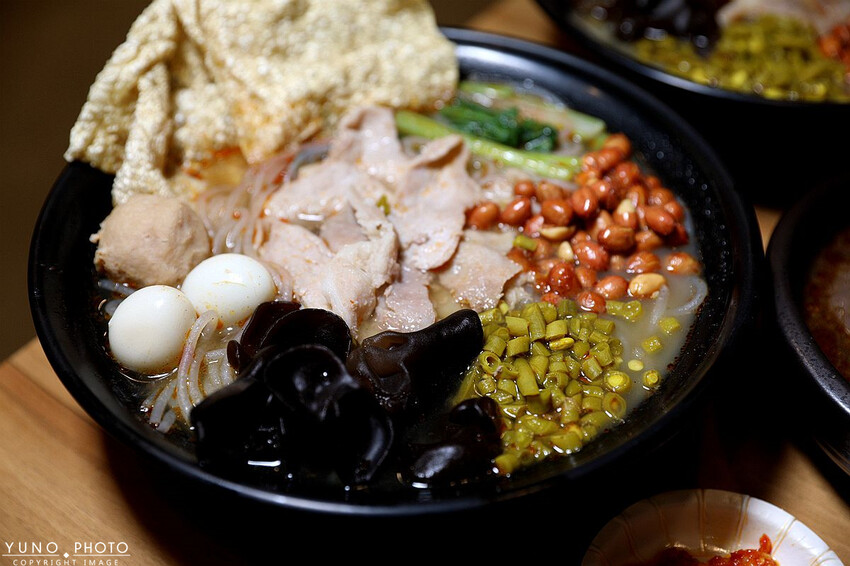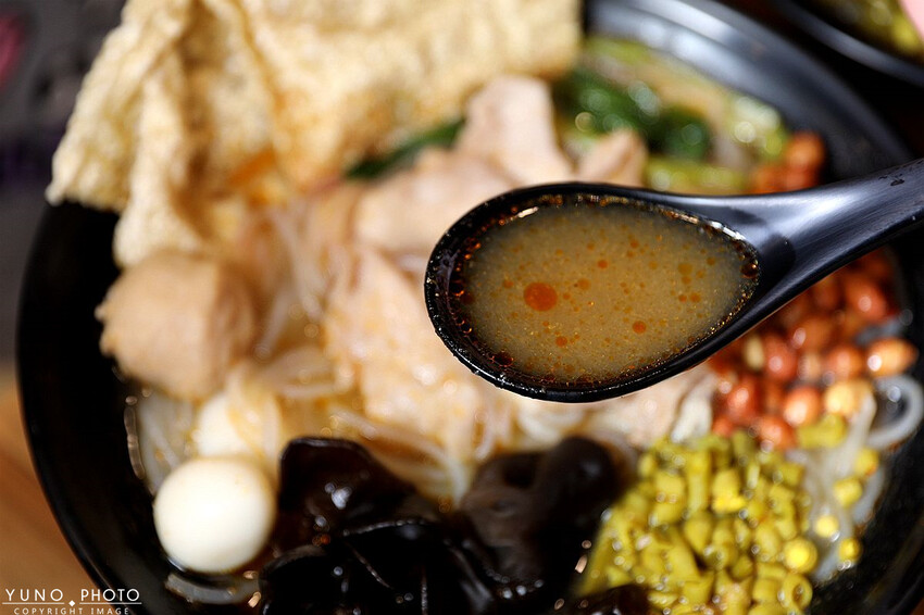 配料有炸豆皮、青菜、花生、貢丸、黑木耳、豬肉片、酸豆角、鵪鶉蛋豐富多彩的組合 讓人食指大動