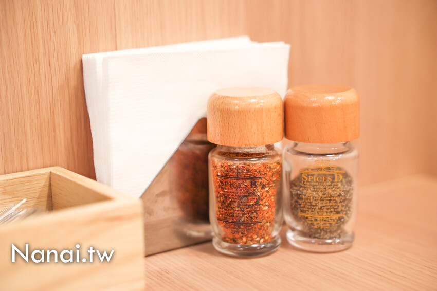 桌上有放置面紙、胡椒鹽、辣椒粉、餐具可使用。