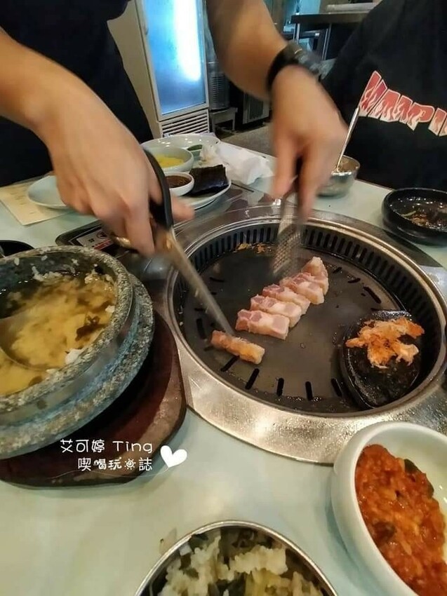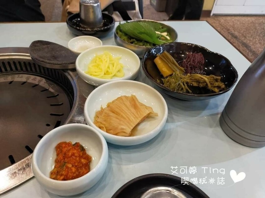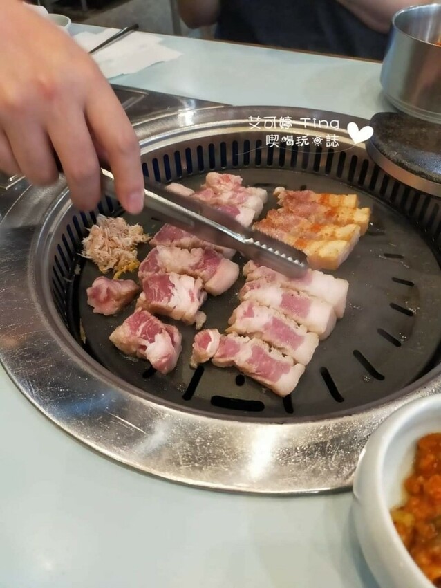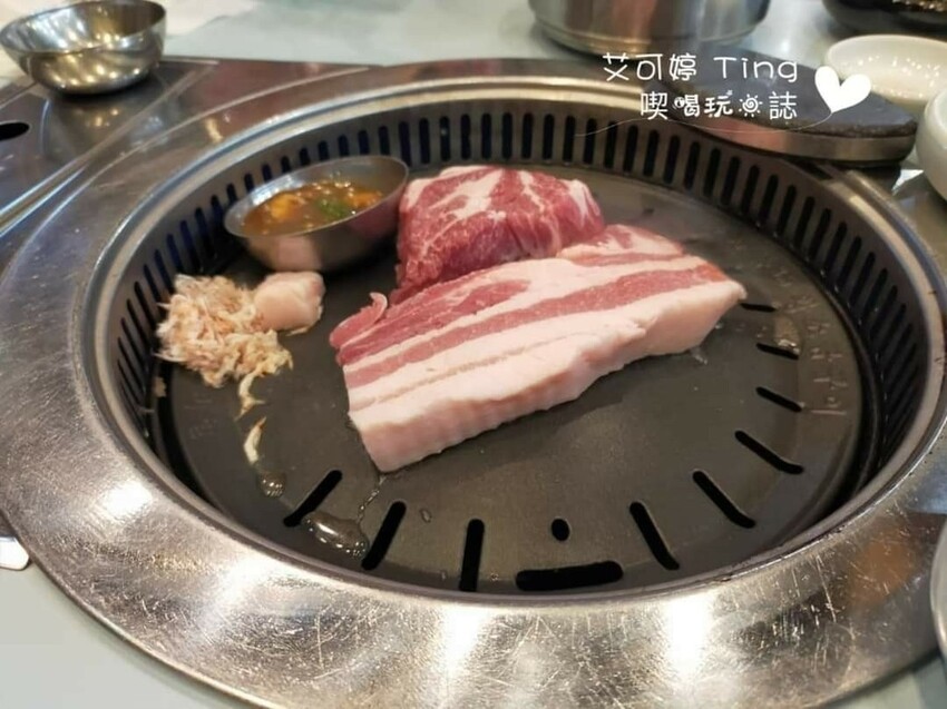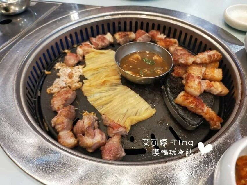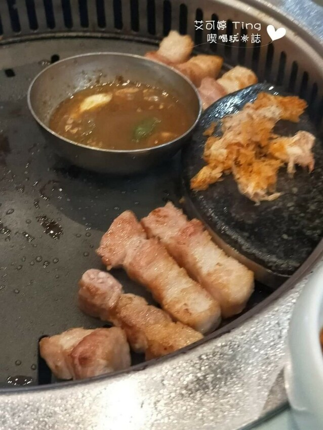五花肉外皮烤的酥酥脆脆,單吃就很好吃,可以沾中間加熱過的醬提味,也可以隨意搭配桌上的小菜一起吃,味道更豐富也很解膩喔