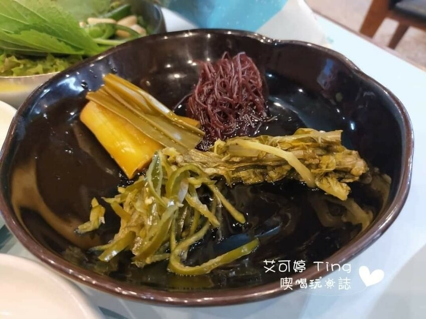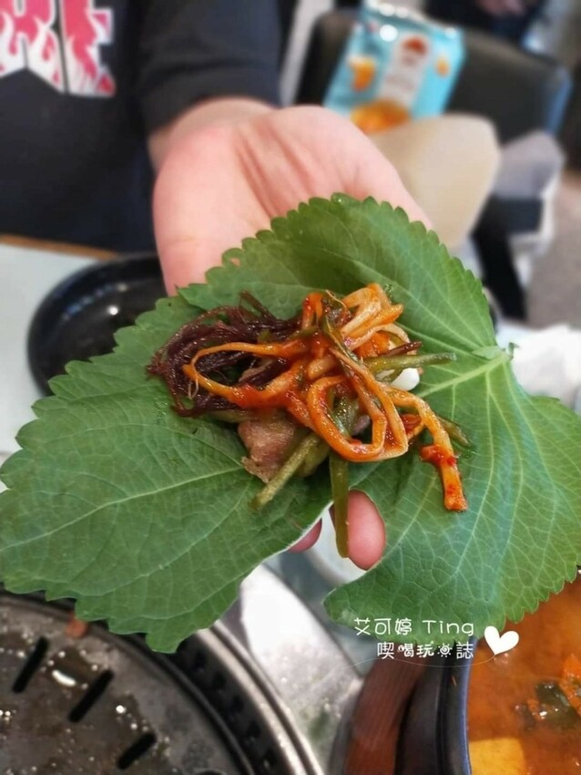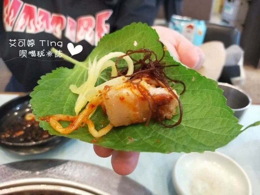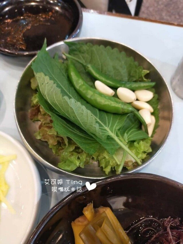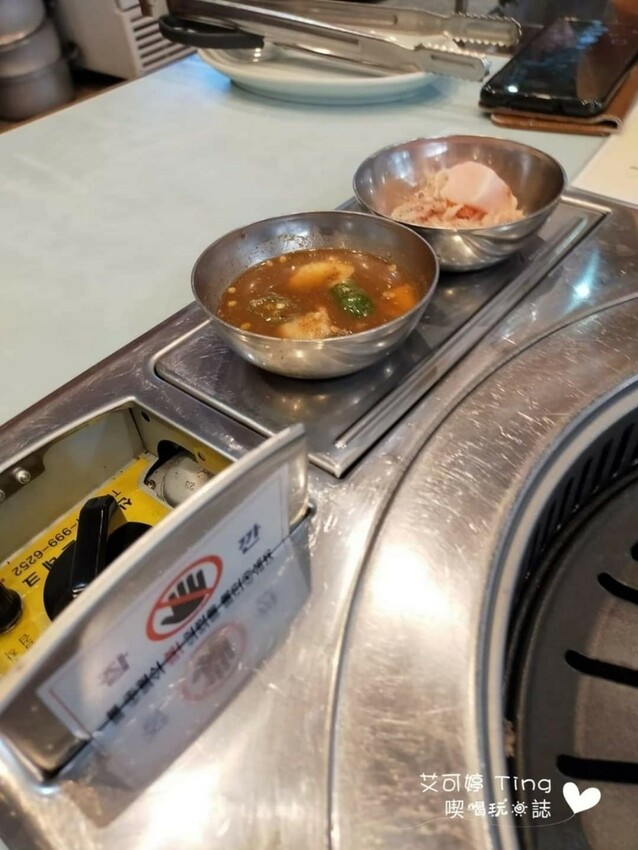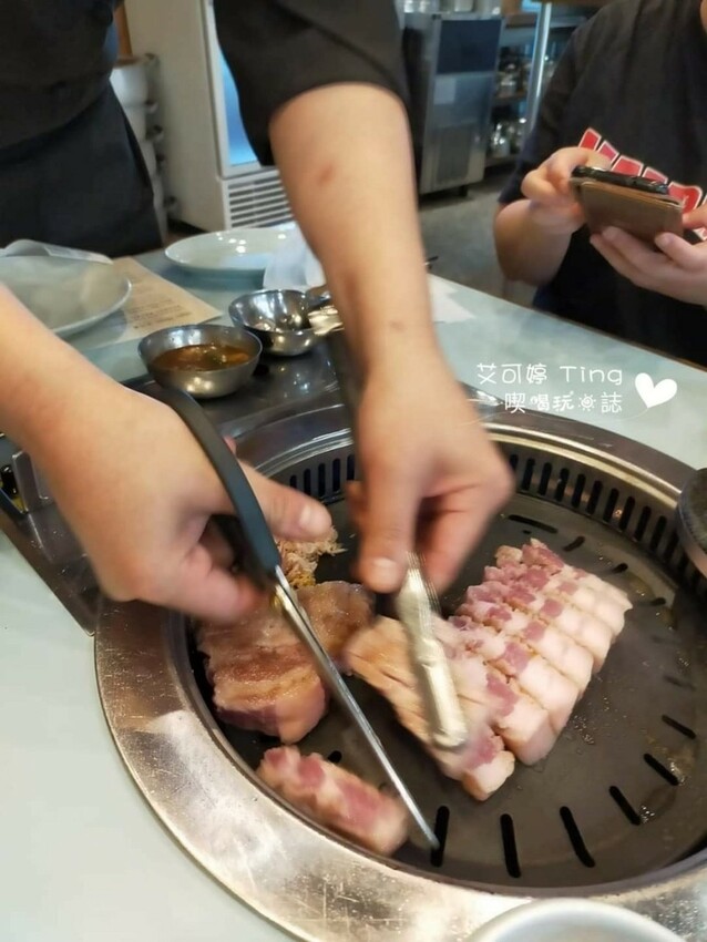 五花肉外皮烤的酥酥脆脆,單吃就很好吃,可以沾中間加熱過的醬提味,也可以隨意搭配桌上的小菜一起吃,味道更豐富也很解膩喔