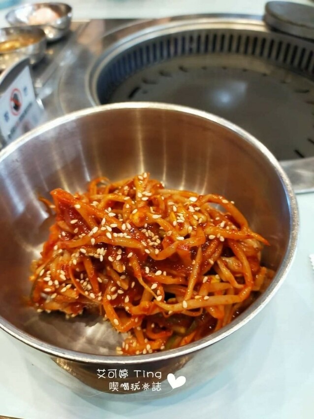 等到都烤的差不多的時候,會將桌上的酸泡菜放進烤盤上加熱,這時候烤肉也差不多完成可以準備開吃了