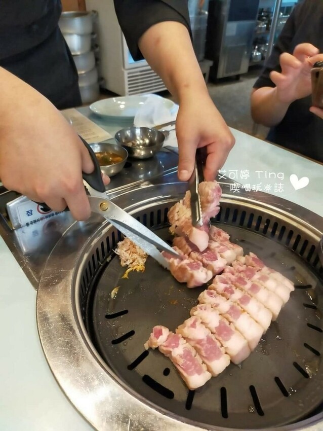 正反兩面烤的差不多的時候,店員就會用剪刀剪成適合的大小,而且烤好的豬肉還會排的很整齊