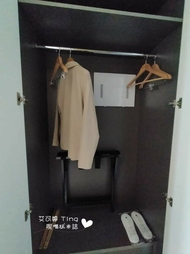 一進房內的右手邊有個衣櫃,除了有衣架,還有提供拖鞋,我們隔天有請人打掃房間,鞋子倒是沒有補,不過也沒關係,我自己有習慣帶夾腳拖鞋