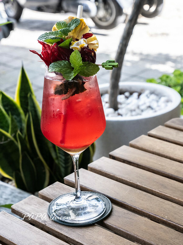 整朵洛神花醃製穿起整個飲料的核心主軸,黃色的鳳梨片 (店家自製烘乾)是當天唯一的男士的飲料,至於那些果乾蜜餞直接被我們這群女生"搶奪"。