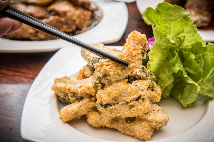 魚排,這倒也是經典,之前到其他活魚餐廳吃過類似的炸魚排,但麵衣都快跟魚片還要厚….,這邊的魚排超讚,麵衣超薄脆,魚排肉質細膩且厚,算是變化版的,可以搭配調味鹽或是特調甜辣醬,小朋友的最愛