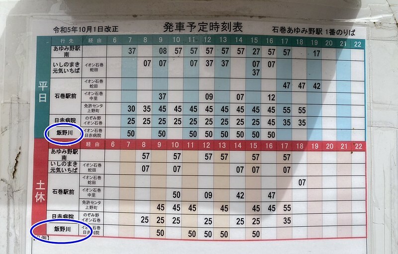 但,如果你在仙台利用google map查詢,它應該會叫你在「石巻あゆみ野」下車,這裡有巴士可以直達飯野川,或者你可以理解這輛巴士會途經石卷線的「鹿又」車站。(藍色是巴士、紅色是JR火車)。