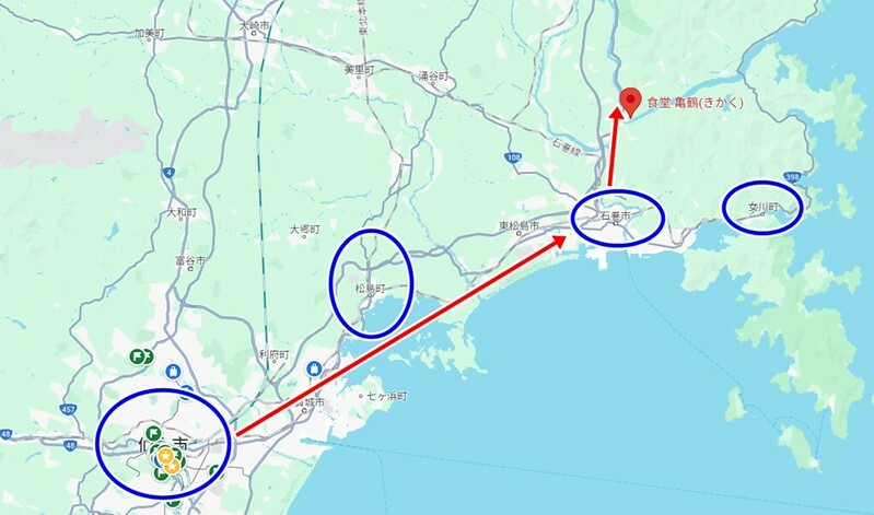 食堂きかく位於石卷的飯野川猜想搞不好日本人都不見得聽過的「小町」,但相信對日本地理略有概念的都知道「石卷」;接下來,我們用三張google map告訴大家飯野川大概在什麼地方,以及「食堂きかく」該怎麼去。首先它的地理位置是在石卷市,但離石卷市中心有一大段的距離,比較靠近的車站是同為石卷線的「鹿又」車站,理論上從仙台市出發可以搭仙石線到石卷,再轉石卷線到鹿又後,於鹿又車站轉巴士到飯野川下車。聽著是不是很麻煩....,但為了五郎必需可以。當然,你也可以自駕啦。