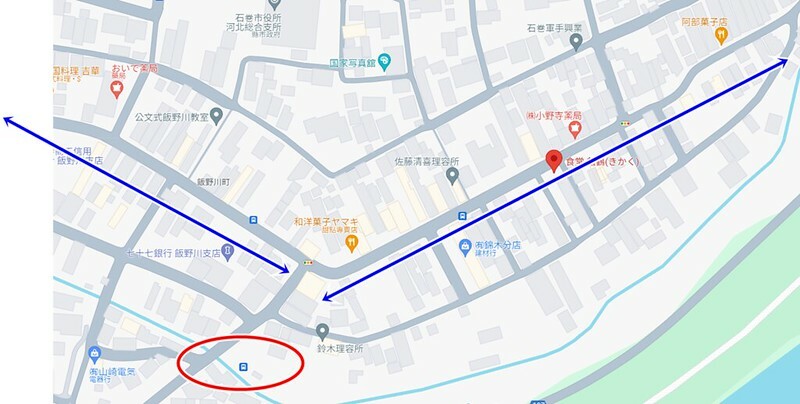 飯野川下車的地方在地圖下方的紅圈,而飯野川町最熱鬧的地區就在兩條藍色箭路的馬路上,食堂きかく也是。另外,這篇我會順便介紹兩家飯野川老字號的甜點,剛好一洋一日。
