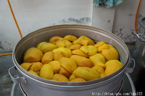 一字排開的大型鋼鍋,甫蒸好的南瓜,色澤豔麗,鬆軟誘人,空氣中瀰漫著濃郁的香甜味,頓時讓人想偷偷挖一口嚐嚐。大火旁,老師傅站在鍋邊,專心的用長柄杓絞拌著,經店長介紹,方知,這裡頭就是去皮去籽冬瓜現熬的冬瓜茶,為了證明他們不是用冬瓜磚,老師傅專誠自鍋中撈出,已被熬煮得沒魂的冬瓜塊出來見人,看到這一幕,相信,再多的廣告詞都不用了。