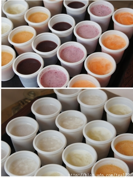 鮮奶調味飲品則是我的最愛,山藥芋奶、地瓜芋奶、木瓜芋奶、山藥南瓜奶、地瓜南瓜奶…,濃稠綿密的口感,太好喝了,怎麼區分是天然食材還是香精?呵…口口都吃得到南瓜和芋頭,偶而還需要嚼一嚼的,就是真品啦!由於這家店都是使用新鮮食材與鮮奶,因此,是有賞味期限的,一個小時內要喝完,以免腐酸變質,有了這藉口,我就不用裝淑女了,這把年紀了,反正也不用留給別人探聽,豪邁的一口氣咕嚕咕嚕喝完了店內提供客人試喝的十七種產品,這可是我今年一整年到茶吧加起來都不到的量,哇,太讚了!