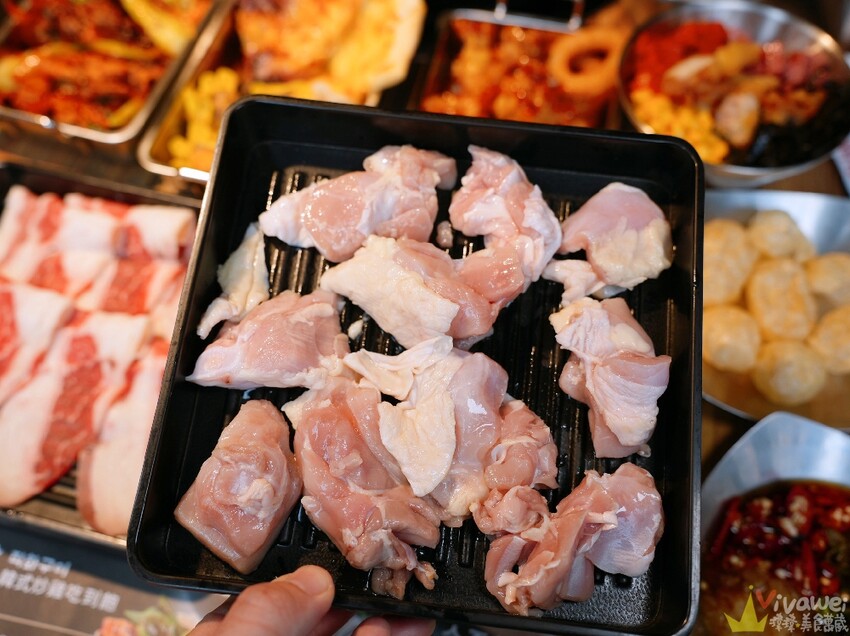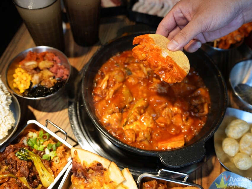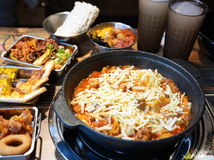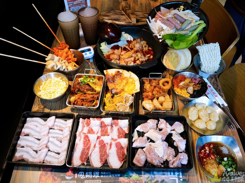 ▲店家供應7種口味道地韓式炒雞及炒豬吃到飽,吃完炒鍋,還能加高湯換吃火鍋!除了炒雞、炒豬及火鍋肉片都能無限續點,自助吧還有韓式炸雞、披薩、韓國魚板串、炸雞奶油飯等韓食吃到飽!
