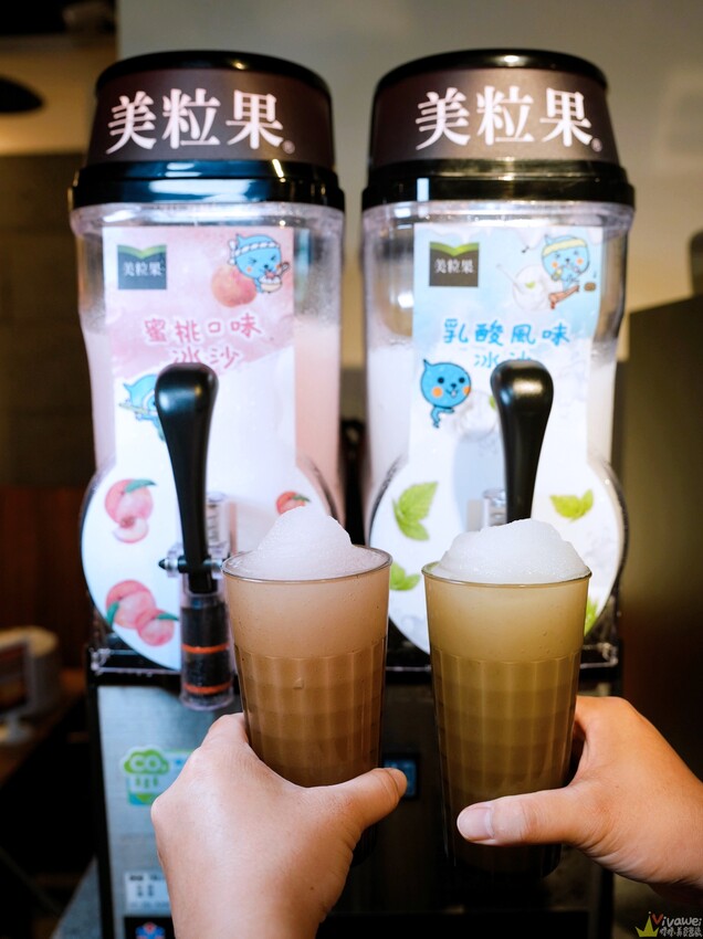 ▲飲品肯定是要喝冰沙才消暑啊!這有蜜桃口味和乳酸風味的冰沙~我覺得蜜桃口味的比較不甜~我比較喜歡🥰另有六款咖啡熱飲,喜歡飯後來杯咖啡的朋友,這邊也都有提供喔!
