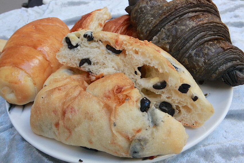 小高今天就選海鹽奶油捲50元、黑橄欖起司巧巴達75元、丹麥可頌80元及松露可頌85元等。