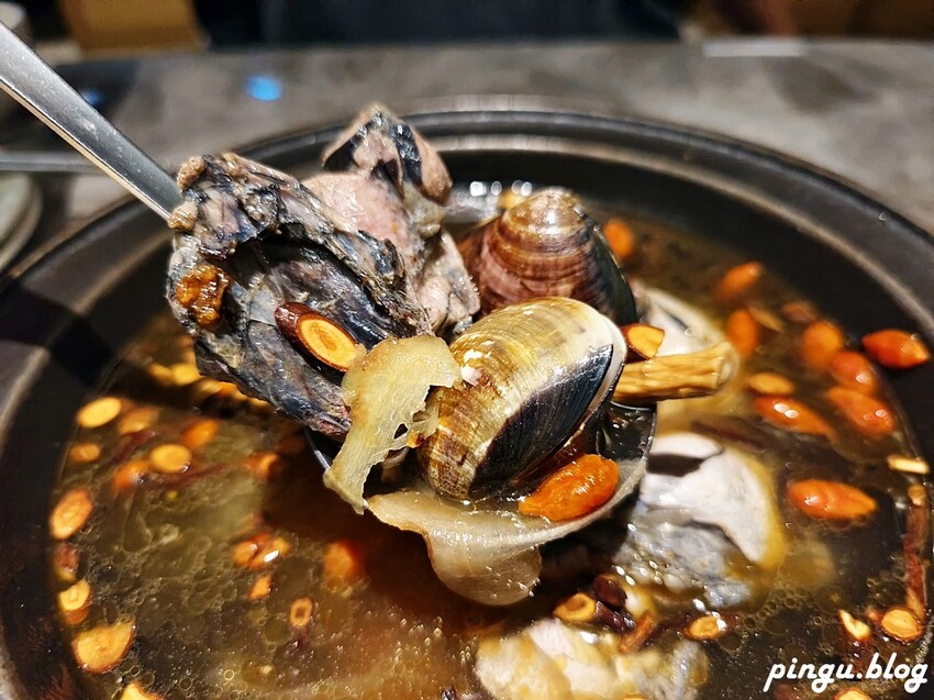燒酒烏骨雞鍋的肉已經在鍋內煮熟,裡面除了有烏骨雞之外還有蛤仔及枸杞等中藥材~~烏骨雞肉的肉質紮實且不柴,經過米酒的洗禮一整個超好吃,酒氣經過烹煮後也逐漸散去,留下來的都是滿滿溫補的精華!!