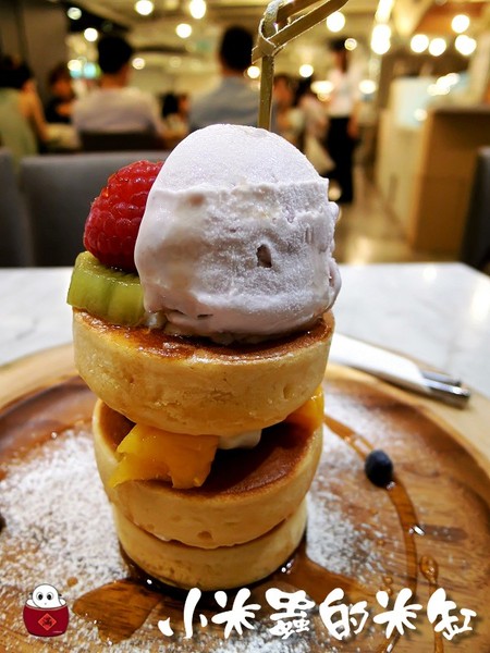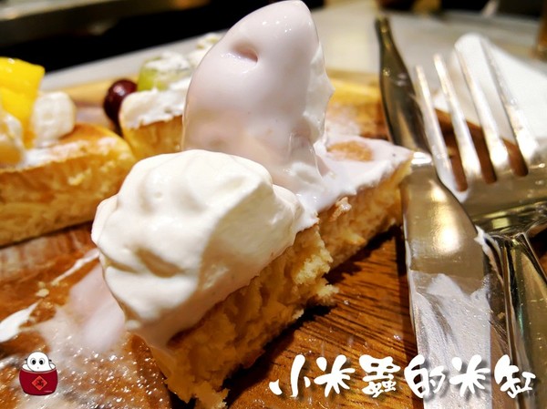 鬆餅與鬆餅之間夾著季節水果(芒果、奇異果)與鮮奶油
