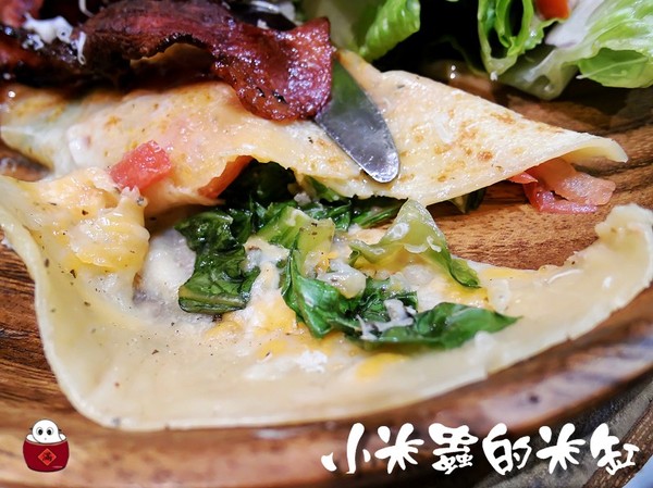 有著生菜沙拉、培根、炒蛋、跟很像蛋餅的薄餅!!