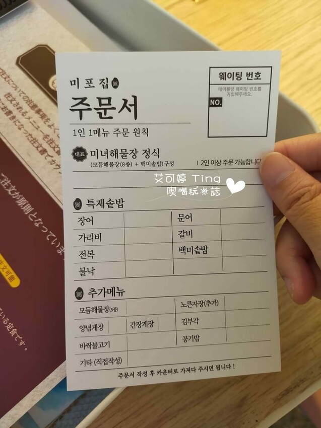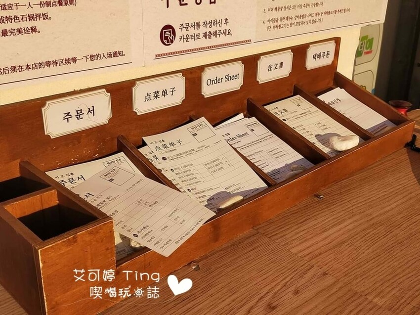 取號完畢後就在另一邊點餐,點餐單子有中、英、日、韓,就算都只有韓文也不用擔心,菜單有圖片可以看
