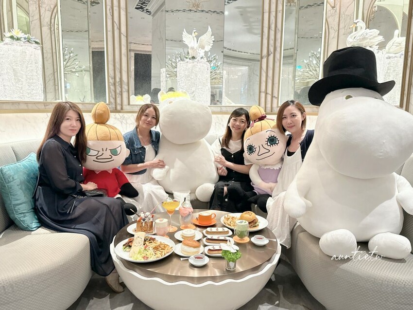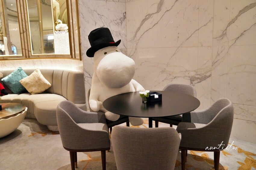 由於這次與Moomin卡通的活動搭配,上葡京大堂酒廊內放上了Moommin 家族各個角色的巨大造型人偶散佈在各個位子上,客人們可以自由地跟人物合影,也可以放在位子旁陪吃陪喝,真的非常可愛。