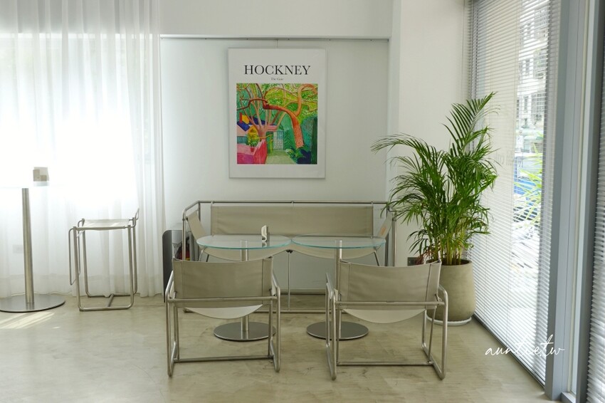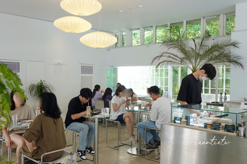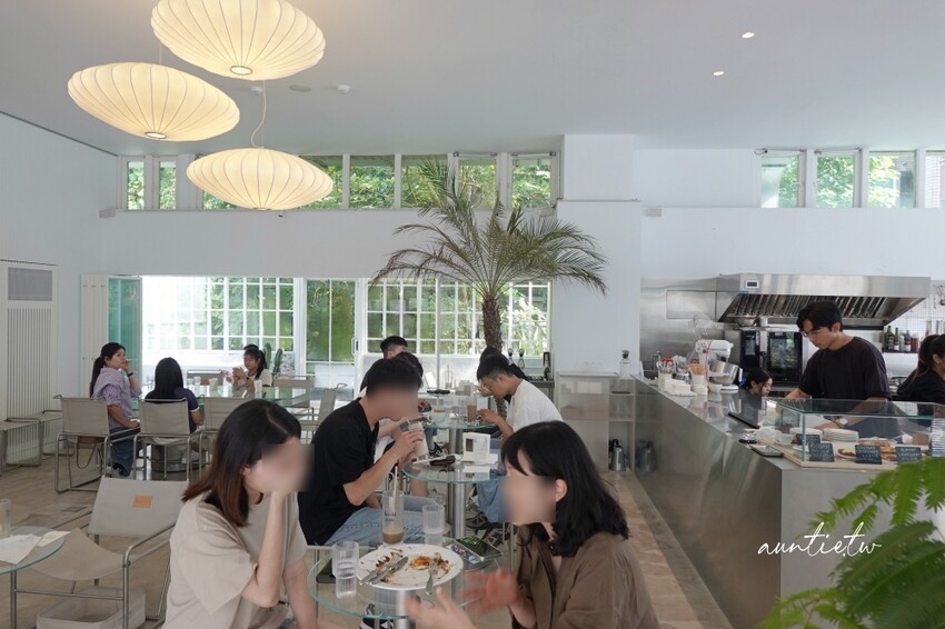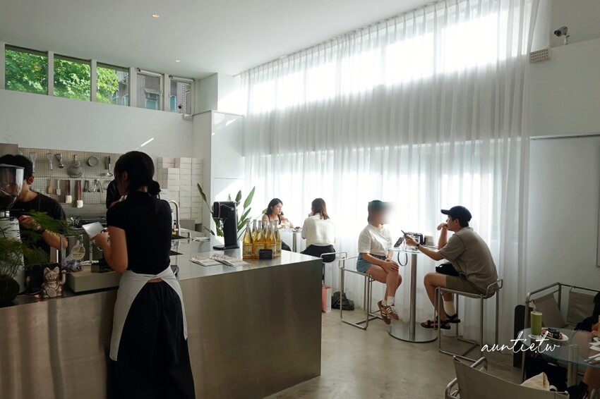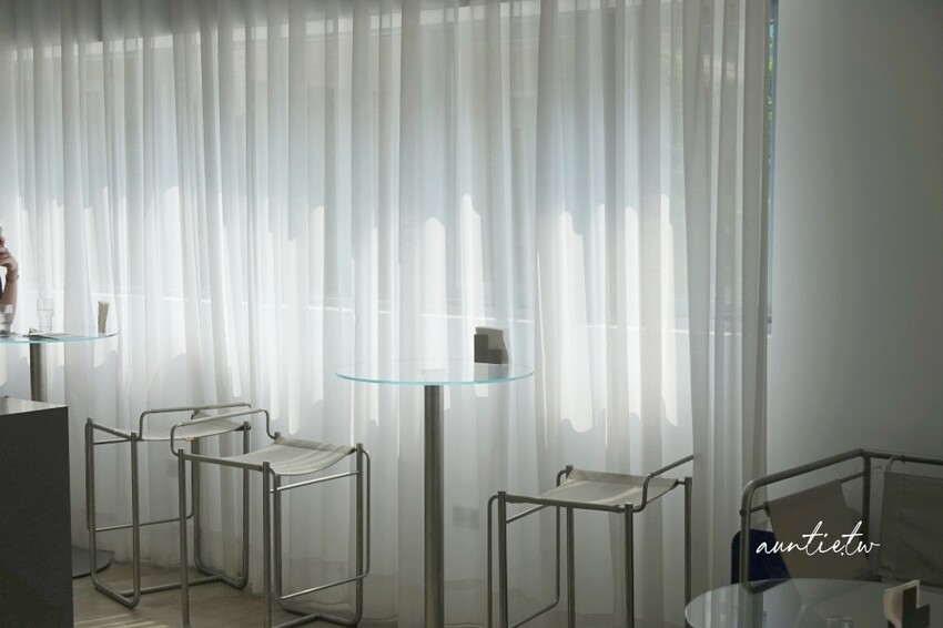 Koshi Cafe內部走的是白色金屬風格,窗簾也是白色系的,整體感覺仙氣飄飄有點網美,不過有些座位還是用露營椅,又帶點中性,很喜歡他們的設計,不會太過度網美風,讓人感覺到很自在,跟大直的「Always Day One」有點相似。