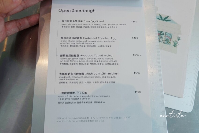 酸種麵包上搭配了蟹肉乳酪、芝麻葉、水波蛋,搭配的是荷蘭醬以及檸檬油醋汁,酸種麵包不知是太薄還是烤得不夠酥,吃起來的口感是濕濕軟軟的,沒辦法吃到酸種麵包本身的香氣有點可惜,吃不太出來蟹肉的味道,乳酪味比較重,水波蛋搭配荷蘭醬相當對味。