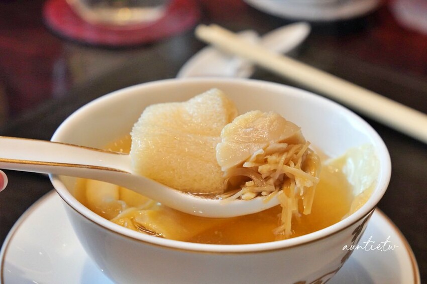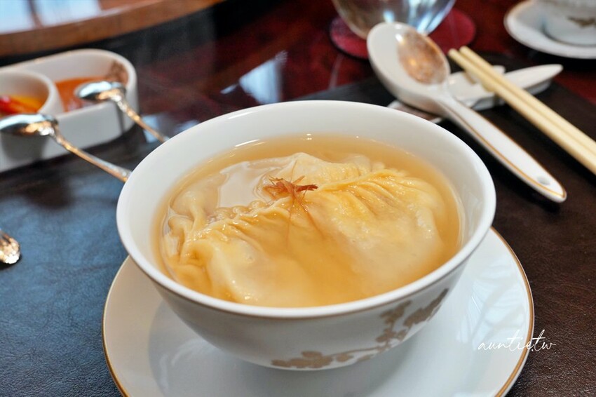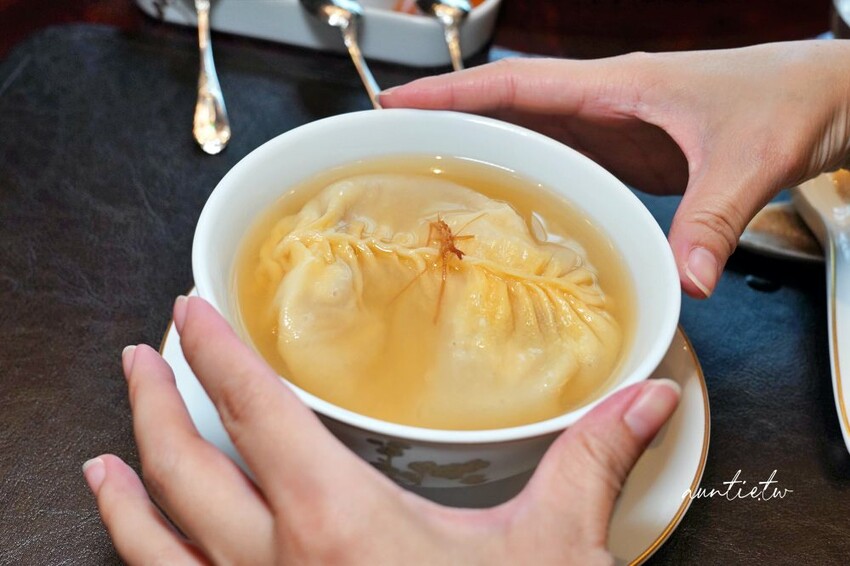 一開始還不知要如何吃起的超大湯餃,服務人員介紹,先吃湯包再喝湯,用湯匙一撈起來,胖嘟嘟的湯餃就像水球一樣,裡頭加入了瑤柱、蟹肉、竹笙,湯餃的外皮相當薄透,湯汁鮮美香醇,喝完也不會覺得負擔太重,相當清爽。