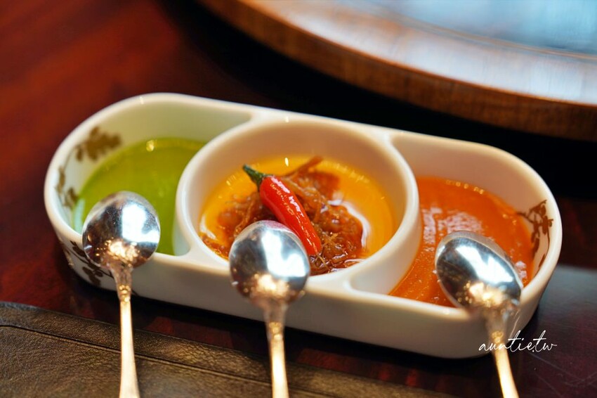 桌上的三種調味料都相當有特色,御花園師傅自製的青色香蔥椒麻醬,使用四川藤椒以及香蔥油以及青辣椒,吃起來有藤椒的清香與一點點的椒麻口感;中間則是XO醬,加入了自家提煉的蝦頭油以及金華火腿以及瑤柱;橙色的則是蒜蓉辣椒醬,三種醬料中超愛香蔥椒麻以及XO醬,真的是沾什麼都好吃,只可惜XO醬不能帶回台灣!