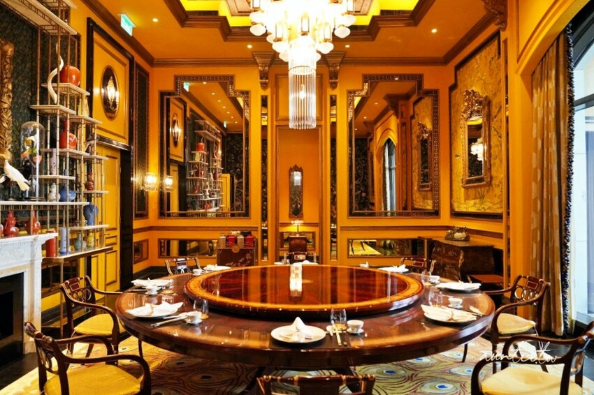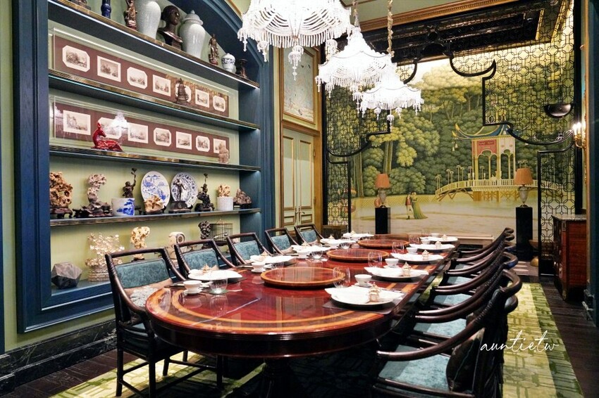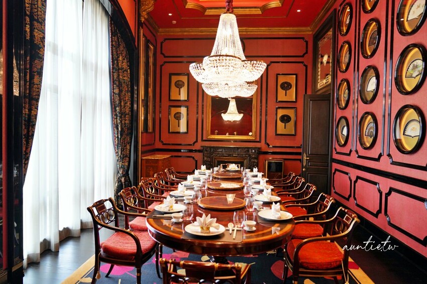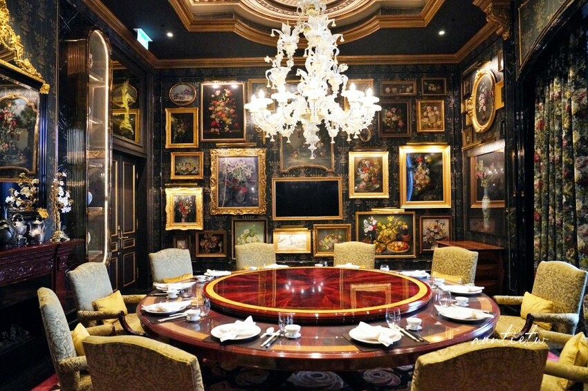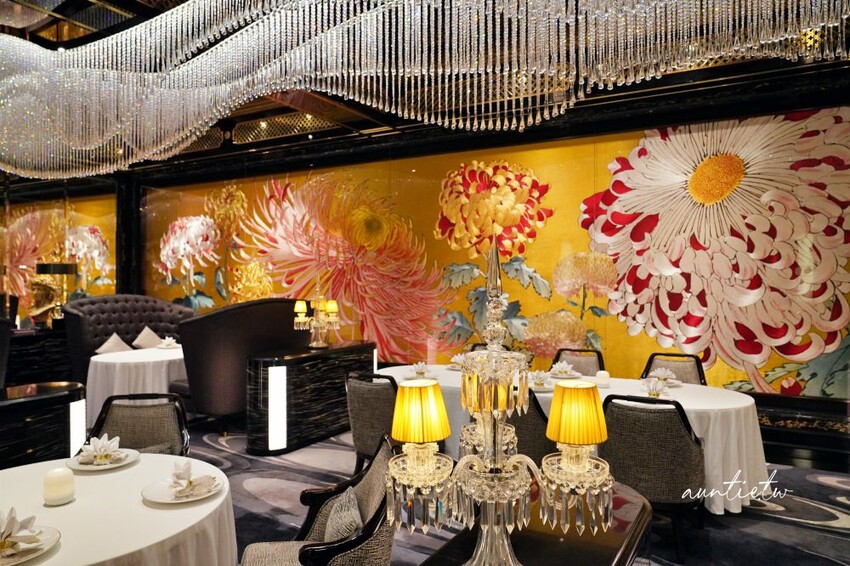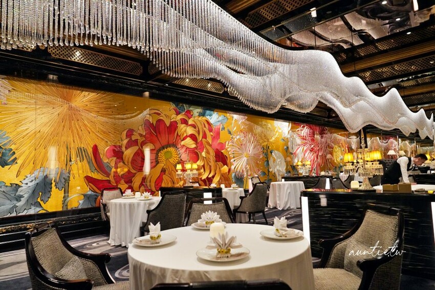 開放式的用餐空間牆上有長達35公尺的菊花蘇繡以及水晶燈,毫不掩飾的中西合併的奢華感,非常壯觀令人驚嘆不已。