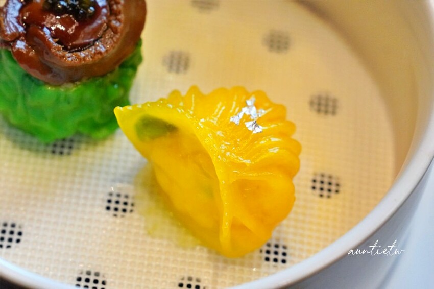 黑魚子醬翡翠鮑魚豚肉燒賣使用菠菜汁製作外皮,伊比利黑毛豬加入肉餡中,再放上鮑魚以及魚子醬,鮑魚口感鮮嫩Q彈;金汁藍天使蝦餃吃起來有濃厚的蝦味,金黃色的外皮十分迷人,搭配著XO醬一起吃,真的是越吃越餓啊!