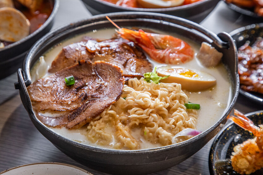 炙燒燒肉鍋(起士牛奶),起士牛奶可是小二春福氣鍋最受歡迎的湯頭,我是搭配炙燒燒肉鍋,隨鍋附上一疊滿滿的炙燒叉燒肉,鍋裡的蔬菜等配料也是滿滿,建議要加點麵,這樣就有點像是吃拉麵的感覺,一鍋兩吃的概念