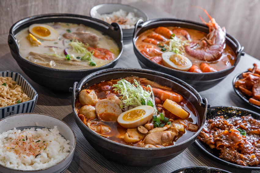 初來乍到,看別人點什麼我們就參考看看,點了很受歡迎的炙燒燒肉鍋(起士牛奶)、蝦爆痛風鍋、重慶酸辣鍋(加點選擇障礙),點鍋物都會附贈一碗白飯跟半顆溏心蛋,另外還點了招牌小菜