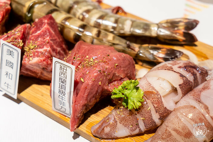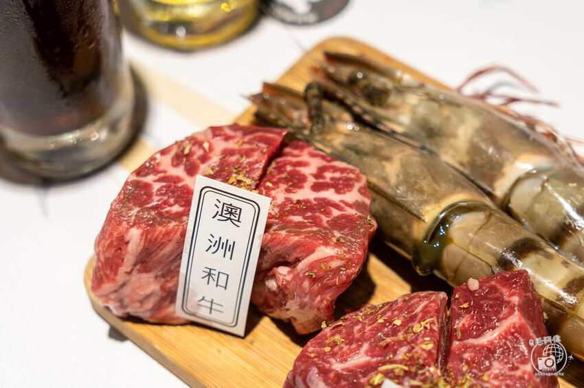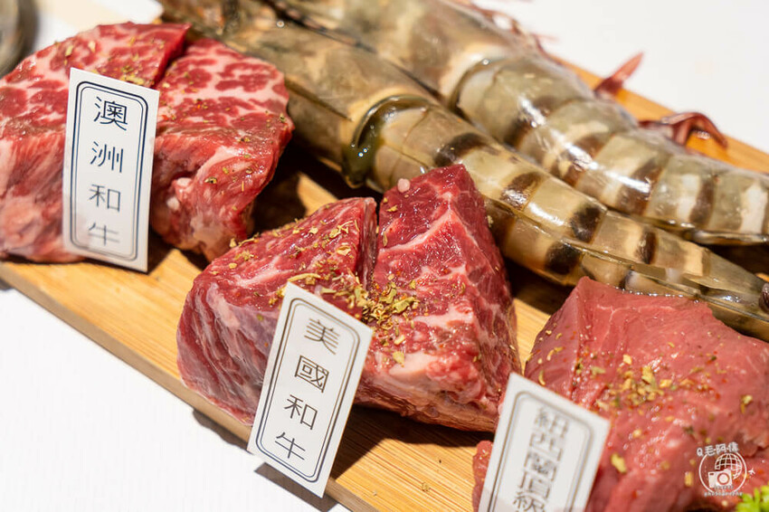 隨後澳洲和牛、美國和牛跟紐西蘭菲力,還有大明蝦跟小卷干貝拼盤就上桌了,最吸引我的,當然是有大理石紋般美妙油花的牛肉拉~