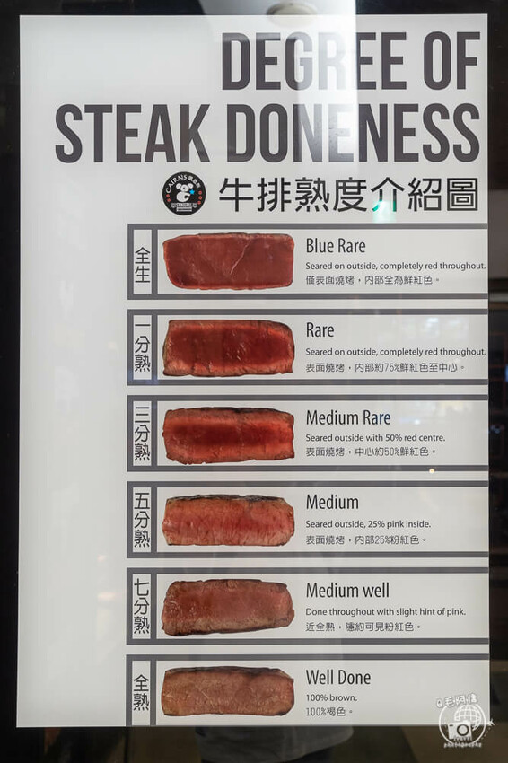 《凱恩斯岩燒牛排》真的很貼心,放這張牛排熟度介紹圖,阿偉真的認為每間台中牛排館都需要!不知道大家都吃幾分熟?一般我都吃5分熟,但能看到原肉的台中餐廳,我會選擇更嫩口的3分熟。