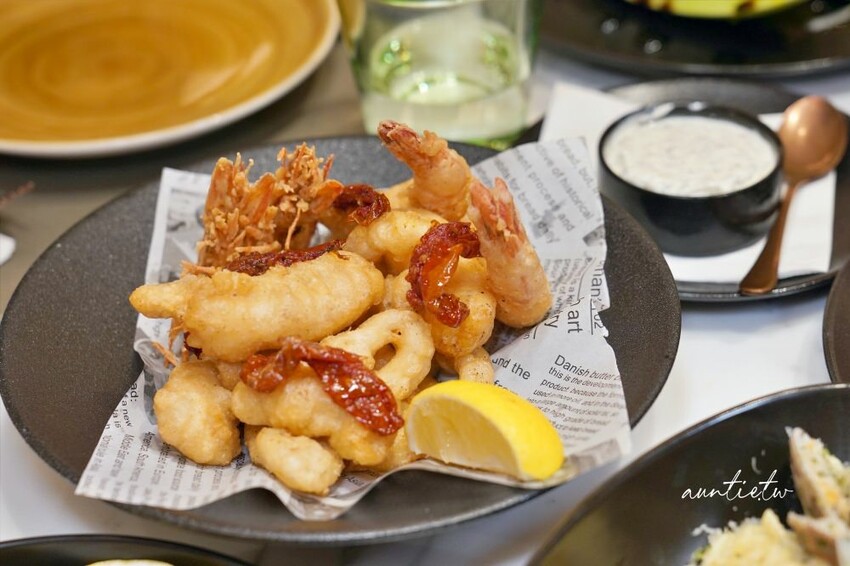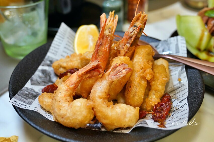 海鮮拼盤則是酥炸海鮮搭配塔塔醬,鮮蝦、花枝、淡菜等都非常新鮮,炸海鮮的口感非常酥脆,連蝦頭都可以吃光光沒有問題。
