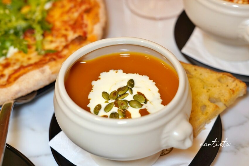 甜甜的南瓜濃湯還加了一點南瓜籽增加口感,濃湯口感細緻綿密,又有南瓜的自然香甜味,喝起來非常暖胃。