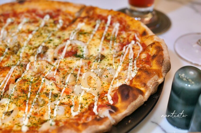 海鮮比薩鋪上了滿滿的花枝、蝦子、花枝、蛤蠣,海鮮種類豐富,一入口滿滿大海的鮮味,在台灣很少看到比薩上會放上貝類。