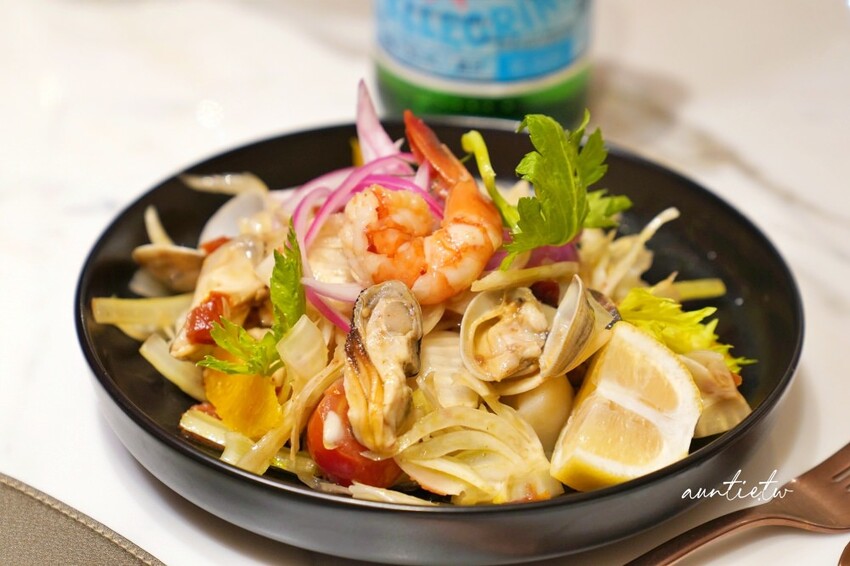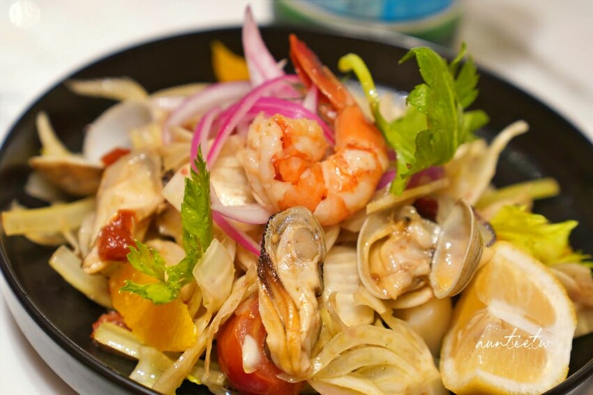 海鮮沙拉配料有鮮蝦、花枝、茴香、醃洋蔥以及柳橙等,醬汁調味偏酸甜,洋蔥沒有嗆味,整體吃起來非常開胃。