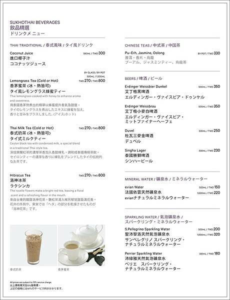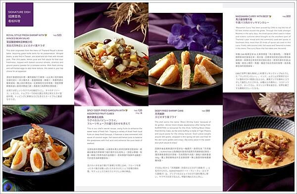 SUKHOTHAI泰式餐廳的菜單區分成海鮮類、咖哩類、熱炒類和特色菜餚,選擇相當多元;而且不愧是五星級飯店,菜單都是中英日文對照,方便外國客人點菜