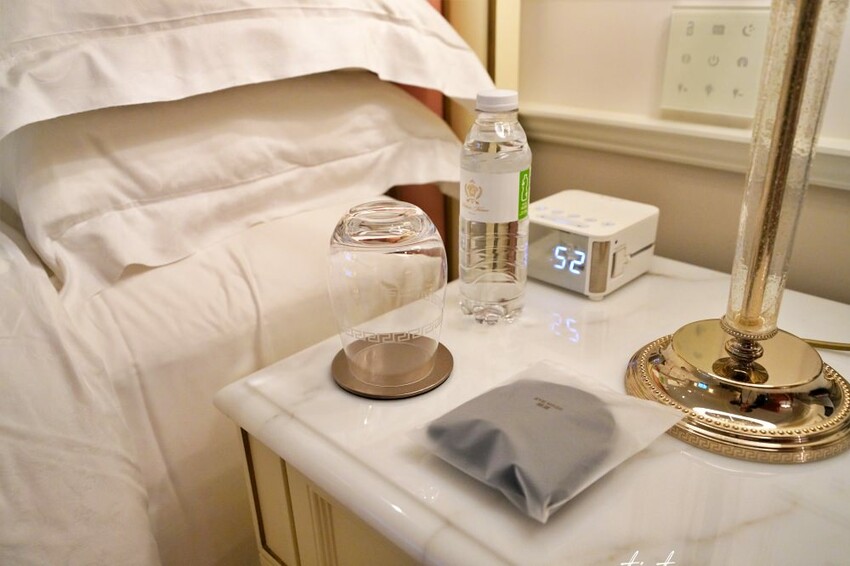 晚上的開床服務,管家很細心地把原本桌上擺的個人用品都弄得整整齊齊,床邊還放上眼罩以及飲用水,超貼心!