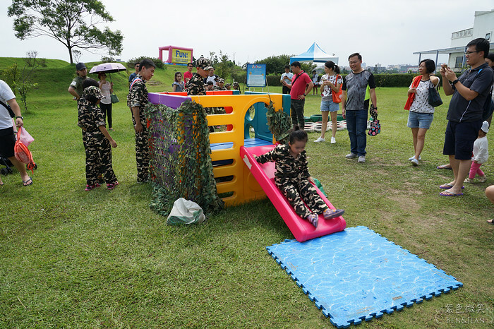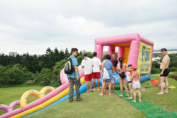 利用草地上的高低,架上了長達四十公尺的氣墊水道。那穿什麼比較好呢!! 如果只是單純的泳裝包覆的比較不夠,小朋友細皮嫩肉的最好是長袖加上短褲之類,避免皮膚的摩擦哦