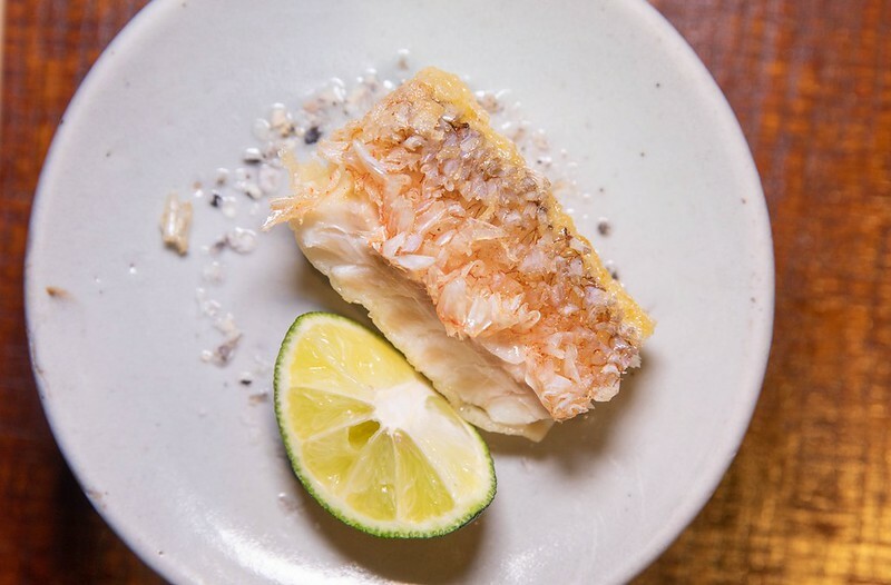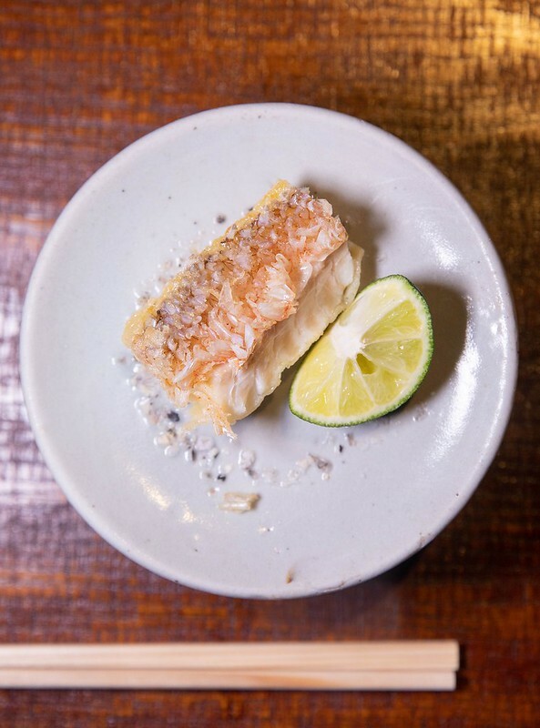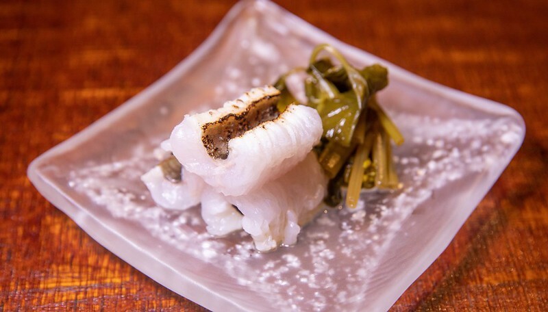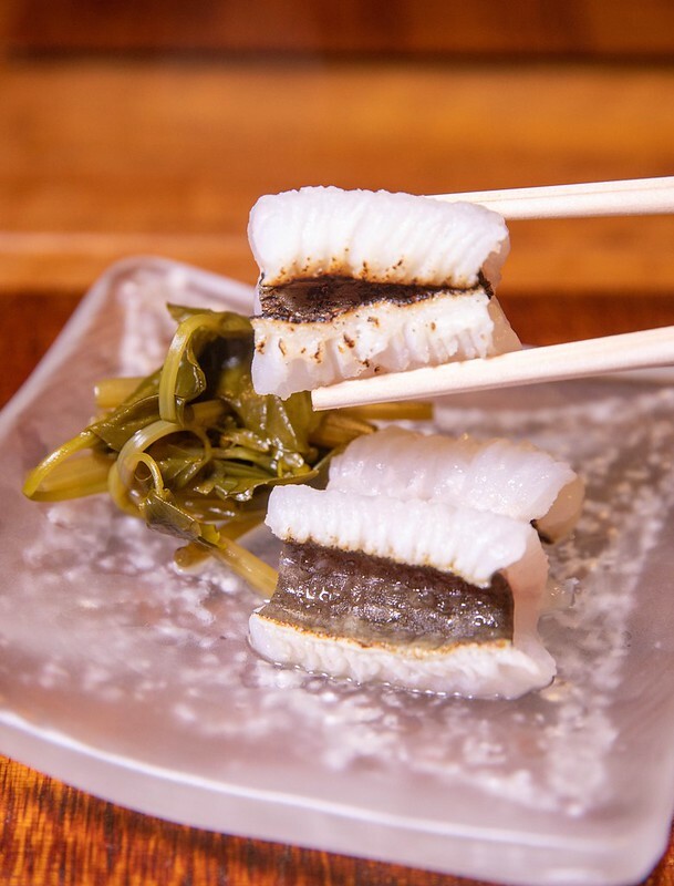 第二道是微烤的穴子,帶皮花刀烤完微捲,入口皮酥微脆,魚肉居然帶著肉汁,分不清是飽嘴還是燙口的口感,讓人捨不得嚥下的咀嚼甜,微沾鹽好吃的忘了牠是誰,猜想這是我吃過最棒的烤穴子,可能還沒有之一。搭配的是鳥取鄉土漬菜,很酸很酸帶著後味討喜的甜,脆口帶點微咬勁。