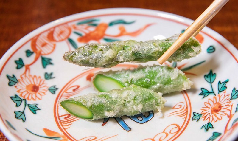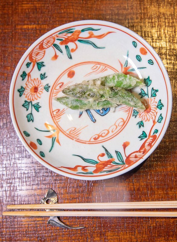 帶路的鳥取友人說這裡除了そば外,天婦羅也很受歡迎,是以午間套餐常見そば、天婦羅雙主菜。話說,這蘆筍真心讓我覺得驚為天人,外邊的麵衣怎可以這麼薄卻這麼酥這麼香,蘆筍絕對是我吃過最多汁最甜的,那天婦羅的香氣和蘆筍的鮮,就像天作之合般,每一口都讓人品味再三,還不斷跳針的重覆:「也太好吃了吧」。