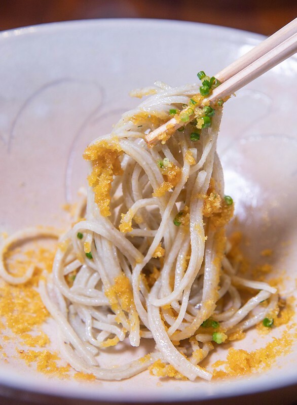 烏魚子拌そば如此吃法別說台灣,在日本我也是第一次嚐到,服務生說鳥魚子是主廚自已醃漬的。是說,鳥取的日料主廚真的都自己做烏魚子...鳥取友人說這裡的主廚閒閒沒事,什麼都自己做(笑)。話說,這烏魚子磨成的粉微爆口帶著少見的香氣噴發,不止沒有擔誤咀嚼後的そば氣息,還像奏般勾出更多そば的麵香,最特別的是そば有著意大利生麵的微粉微粘,後來問師傅才知,那是因為省去了煮完そば冰水洗的動作。另外就是蔥末和隱有似無的微蒜香,真是好吃得亂七八糟!
