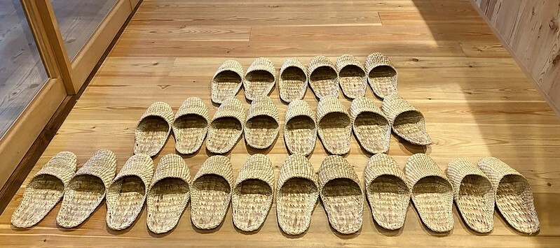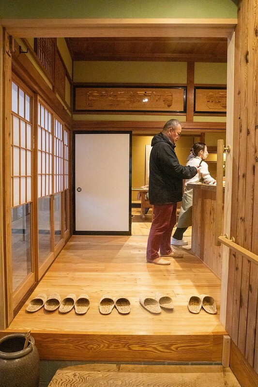一進門伴隨著親切「歡迎光臨」聲映人眼簾的是乾淨得一塵不染的木質地板,老板上早早整齊擺放著一排編織的草鞋。