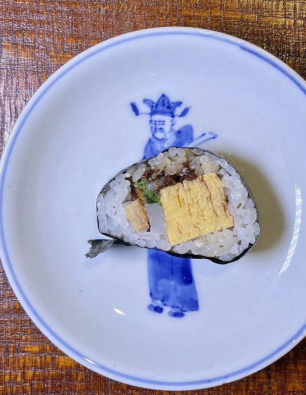除了そば.天婦羅兩大主食外,這裡也經常會出現花卷壽司,據說是因為主廚喜歡吃的綠故。超大的玉子燒增添了咀嚼端的飽嘴和滋潤度,微黏的醋飯和漬製過的瓢瓜酸甜交錯,比較特別的是裡面居然藏著そば,吃飽吃巧也吃滿足。