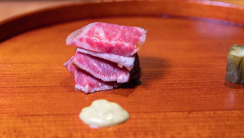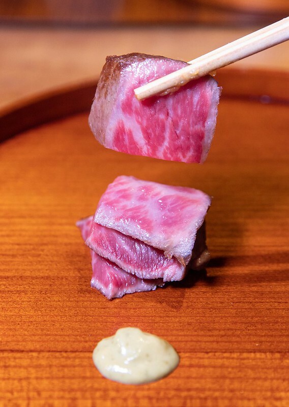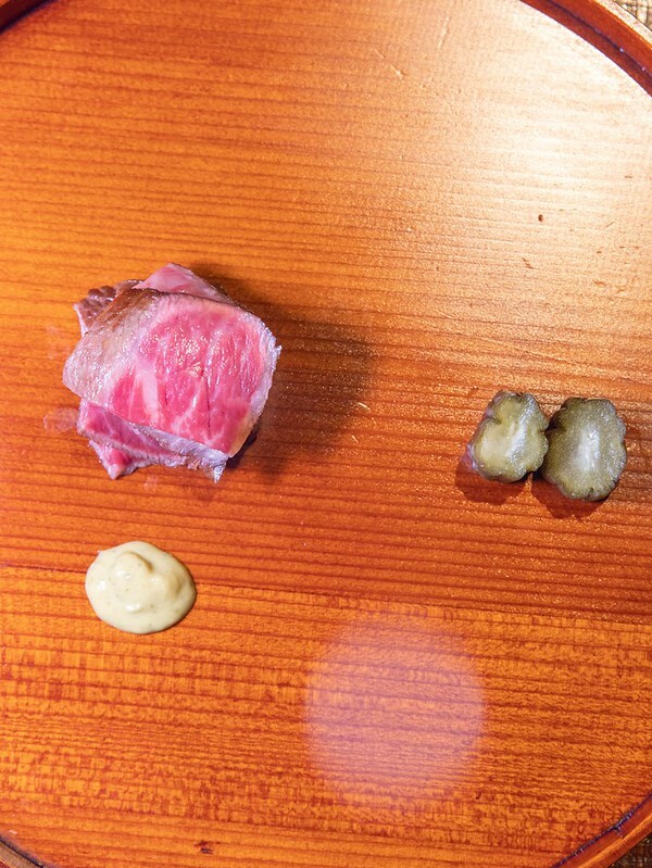 鳥取牛只烤一面,切段後堆疊在木製的餐盤之上,頗有幾分藝術氣息,入口是一聲又一聲的「哇考」,這鳥取牛也太嫩太甜太香了吧....加上若烤又帶點煙燻的誘人氣息和以以黃芥未、焙茶調成的獨門醬汁綴味,真是每一塊都讓人意猶未盡。