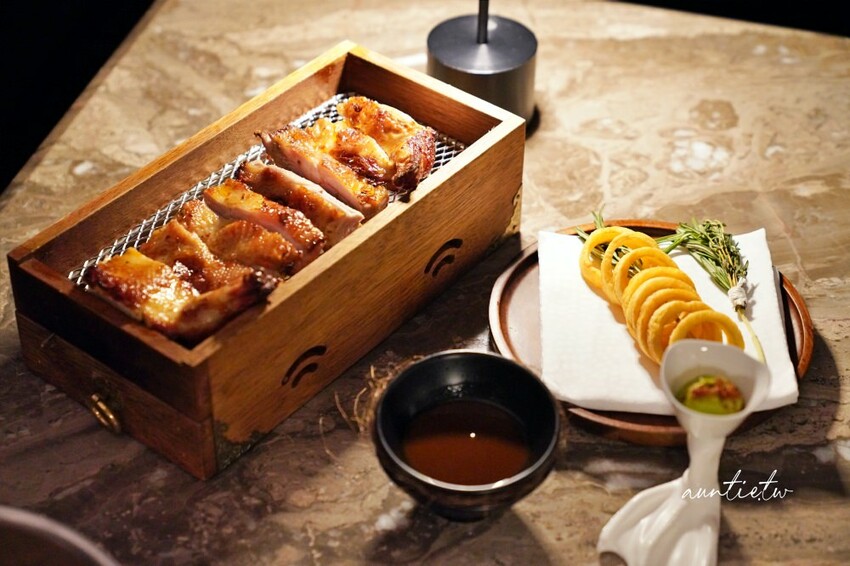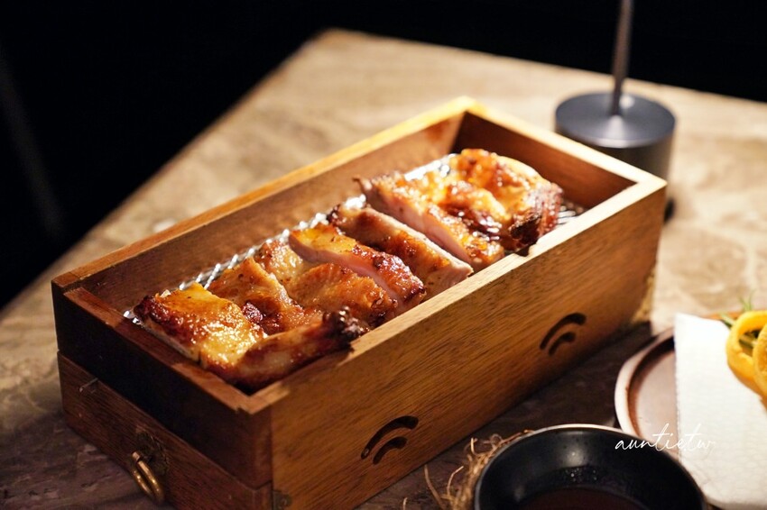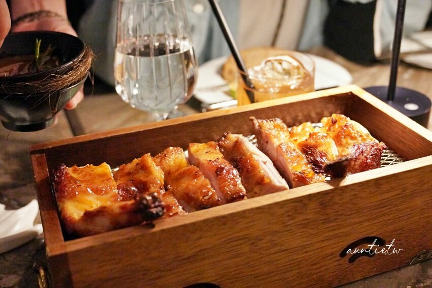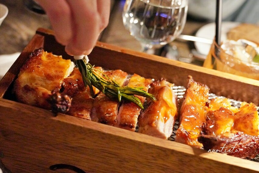 這道葡式烤雞吃法很有儀式感,服務人員將烤雞上桌後再把木盒打開,像是開箱什麼寶盒一樣,木盒下方以迷迭香煙燻烤雞,要品嚐前再用香草沾上醬料刷在烤雞上,雞肉口感細緻柔軟,帶有香草的香氣,經過多道程序的洗禮,更覺得這道葡式烤雞吃法實在很厚工,實際味道也非常值得期待。