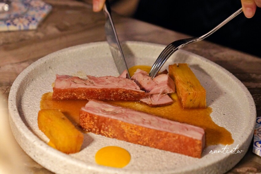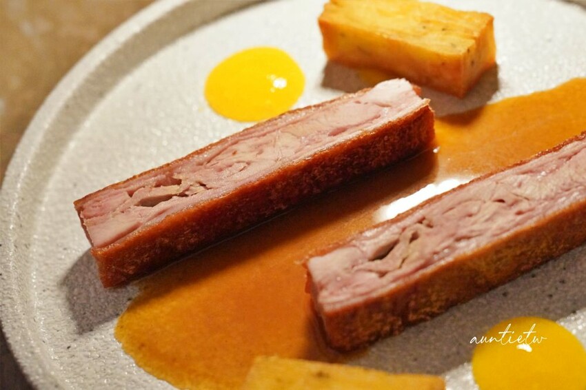 乳豬切成變成像是長方形火腿一般,吃起來的味道帶有香料的香氣,表皮酥脆口味香甜帶有肉汁,搭配香橙醬十分對味。