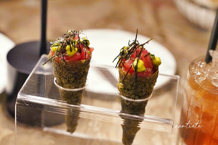 生鮪魚搭配脆口海苔,做成像小甜筒般的開胃菜,醬汁則是辣醬油,口感十分清爽。
