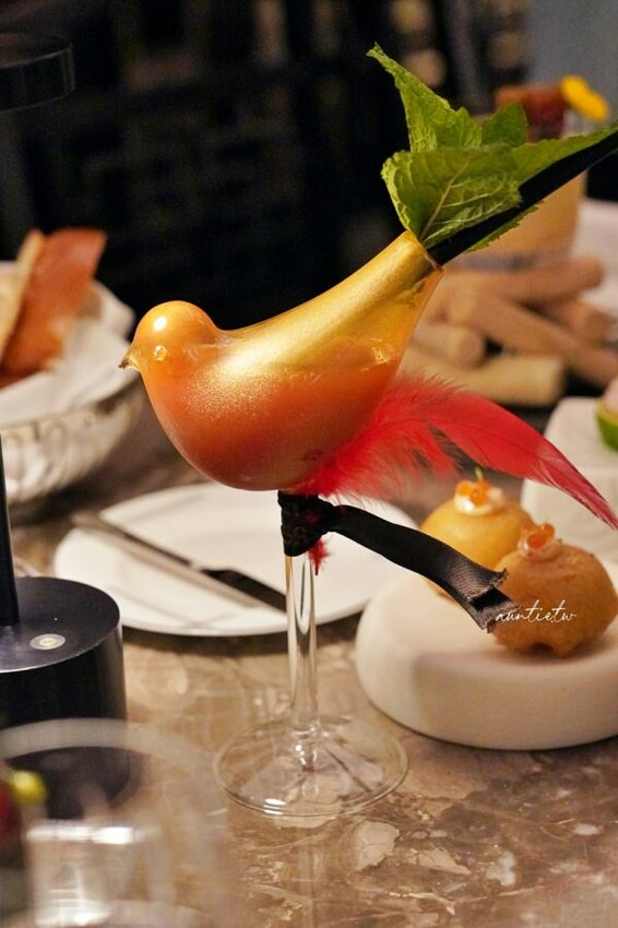 另外味賞的調酒們也非常優秀,不只味道好,造型也非常搶眼,每一桌桌上幾乎都有的「後花園」,做成活靈活現的小鳥造型,以茉莉花琴酒為基底,還加了枸杞、冰糖糖漿,喝起來帶有花香。